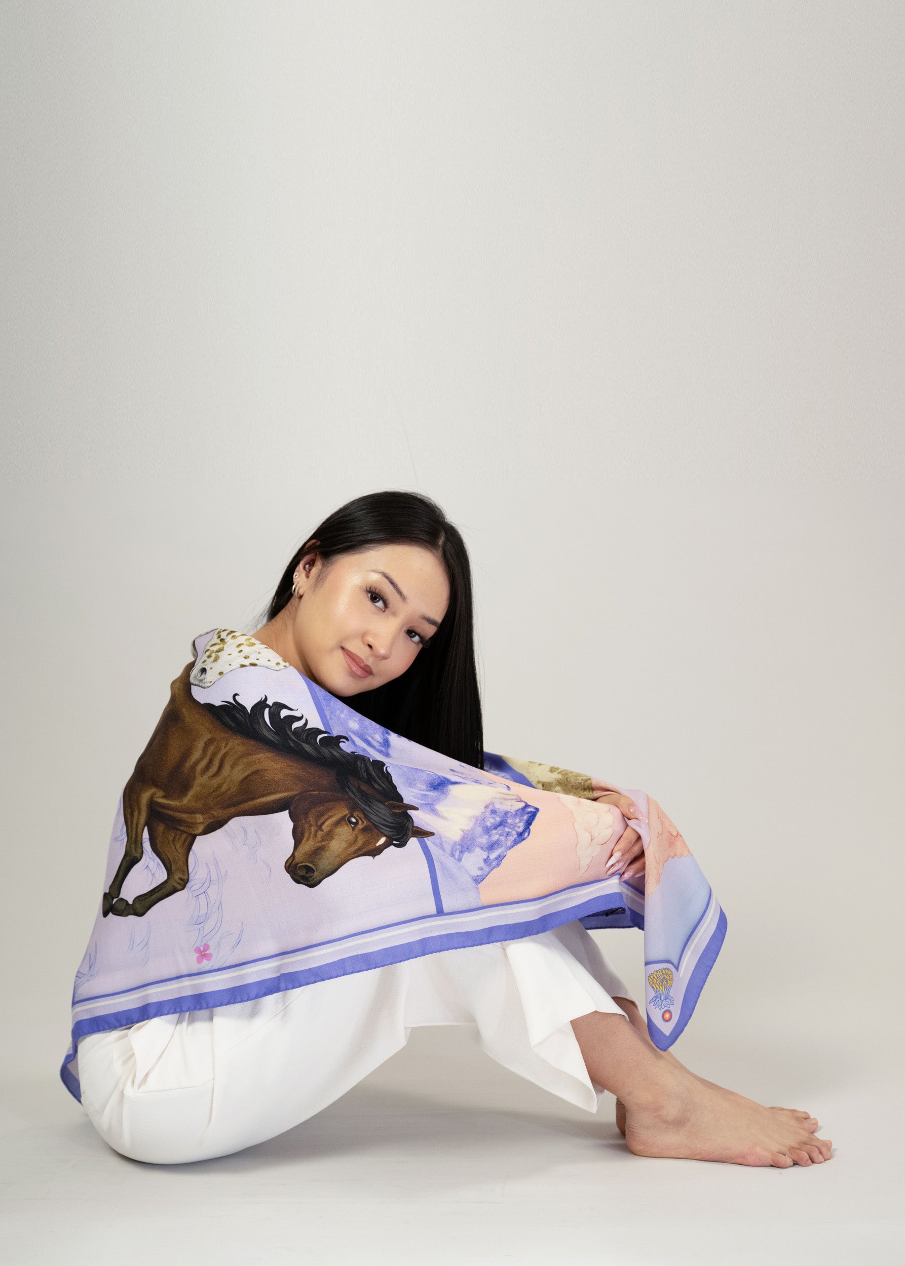 Drift into a world of serenity with our Periwinkle Dream silk scarf. This enchanting design features three majestic horses, with their graceful forms set against a breathtaking mountain backdrop. Soft hues of periwinkle, pink, and blue evoke a dreamlike landscape. As part of the artist's collection, 5% of net profits from the sale of this scarf will be donated to wildlife in need.